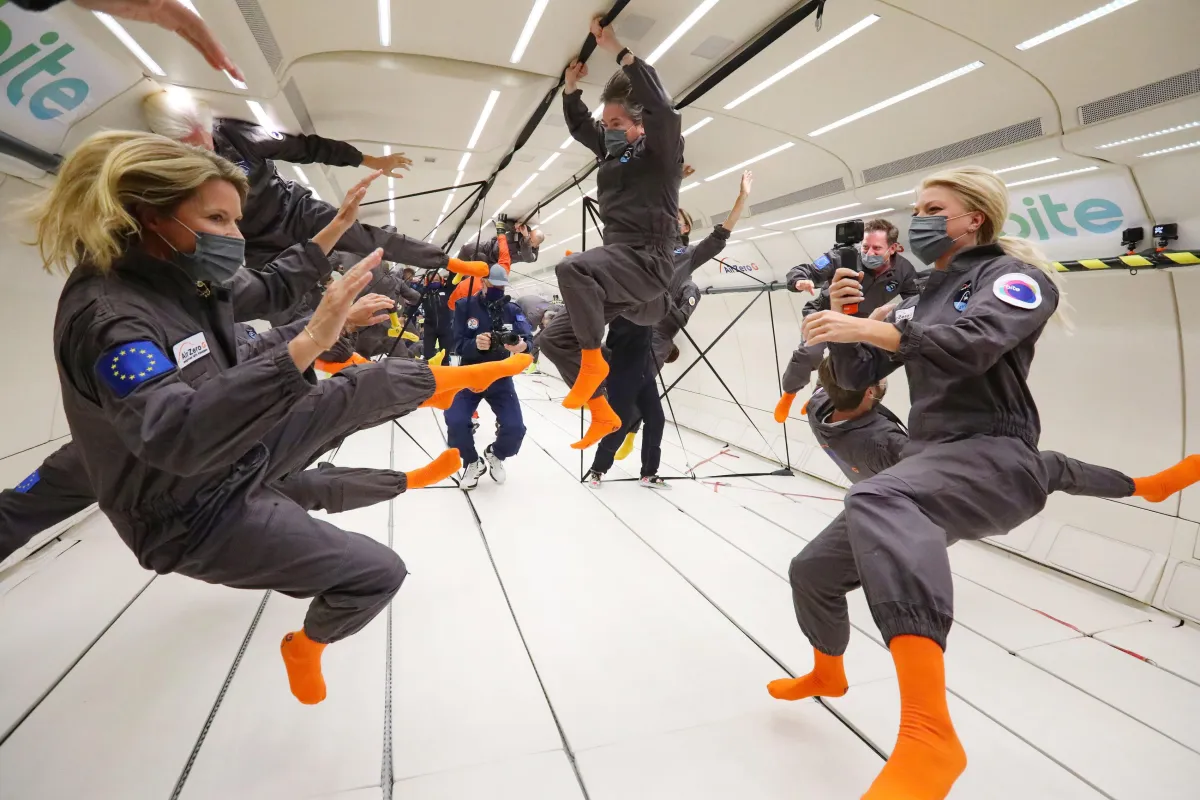 Float weightless on a parabolic flight, experiencing Mars, Moon, and zero gravity.